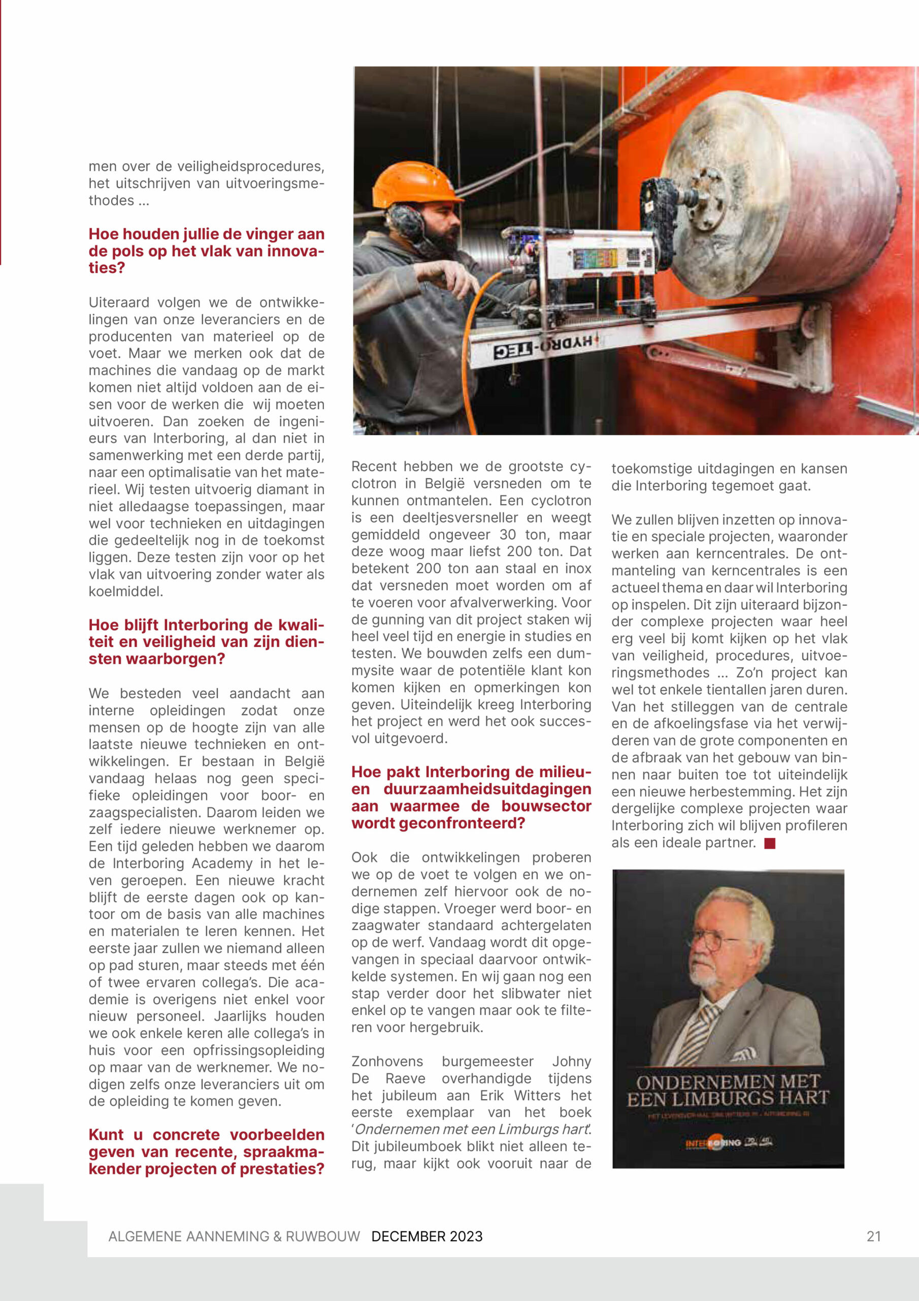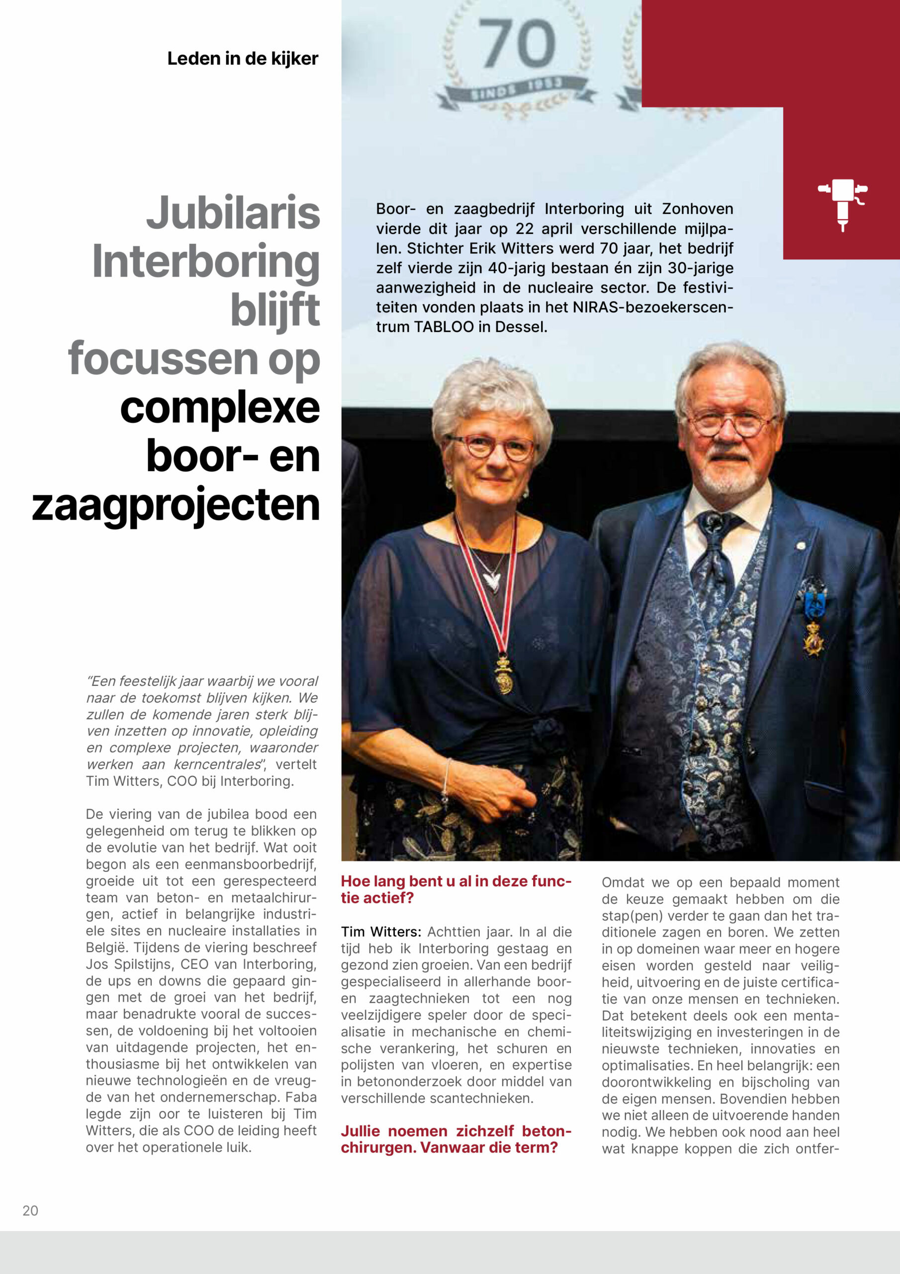 Le 22 avril dernier, la société de forage et de sciage Interboring, basée à Zonhoven, a célébré plusieurs moments importants qui ont marqué son année. Le fondateur Erik Witters a fêté ses 70 ans, l’entreprise elle-même a célébré son 40e anniversaire ainsi que ses 30 ans de présence dans le secteur du nucléaire.